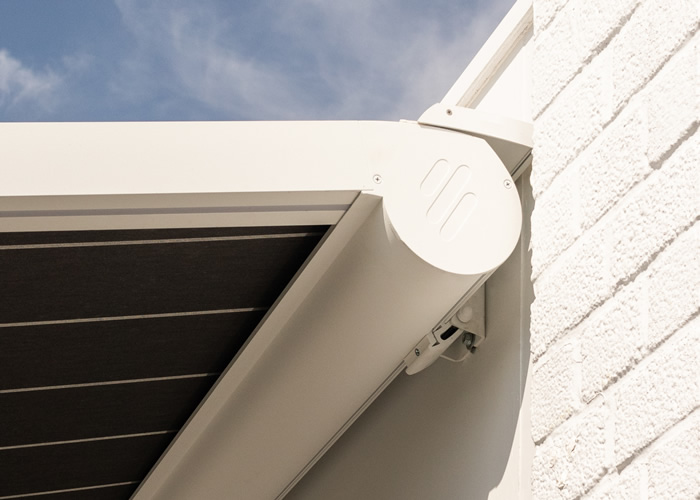 De zijkanten van de zonwering kan je volledig afsluiten met screens om zijdelingse wind tegen te houden. De zijden worden mooi afgewerkt met een vast driehoekig doek en zonwerende ZIP screens. In functie van de afwatering kan je eventueel zelf de hoogte bijstellen aan de hand van de verstelbare voet.