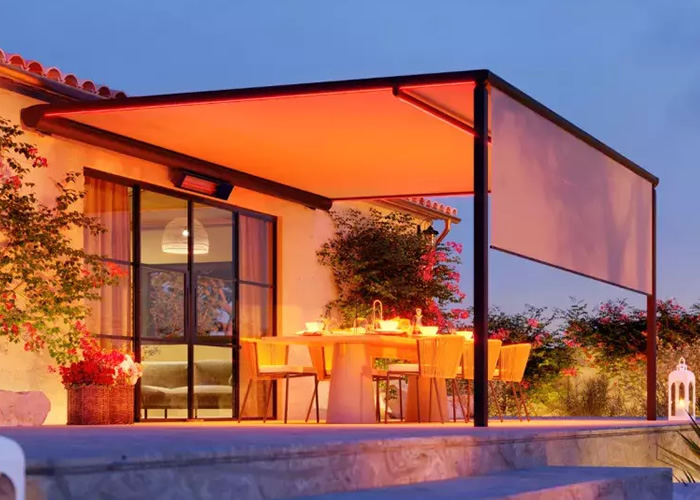 Personaliseer de Brustor B128 naar hartenlust! Dankzij de sfeervolle verlichtingsmogelijkheden wordt het ’s avonds op het terras extra gezellig. Kies voor dimbare ledverlichting in de palen, de zijgeleiders of de ondersteuningsbalk. Een volautomatische, oprolbare volant gestuurd door zonne-energie kan geïntegreerd worden en is de oplossing bij uitstek tegen laagstaande zon ’s morgens bij het ontbijt of ’s avonds bij zonsondergang.