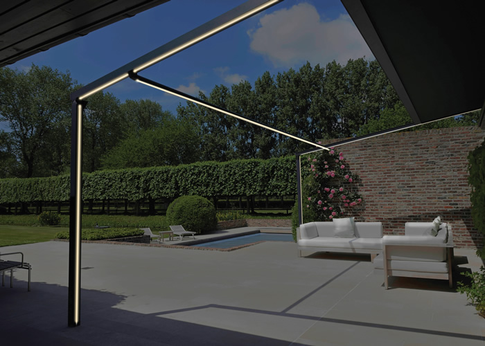 is een aangebouwde pergola met oprolbaar doekdak. Deze pergola staat bekend om zijn minimalistische design. De pergola verdwijnt daardoor als het ware in het landschap en je behoudt een panoramazicht op de tuin. Door het oprolbare doekdak, kan je zelf je hoeveelheid schaduw kiezen en blijft de lichtinval in huis behouden.